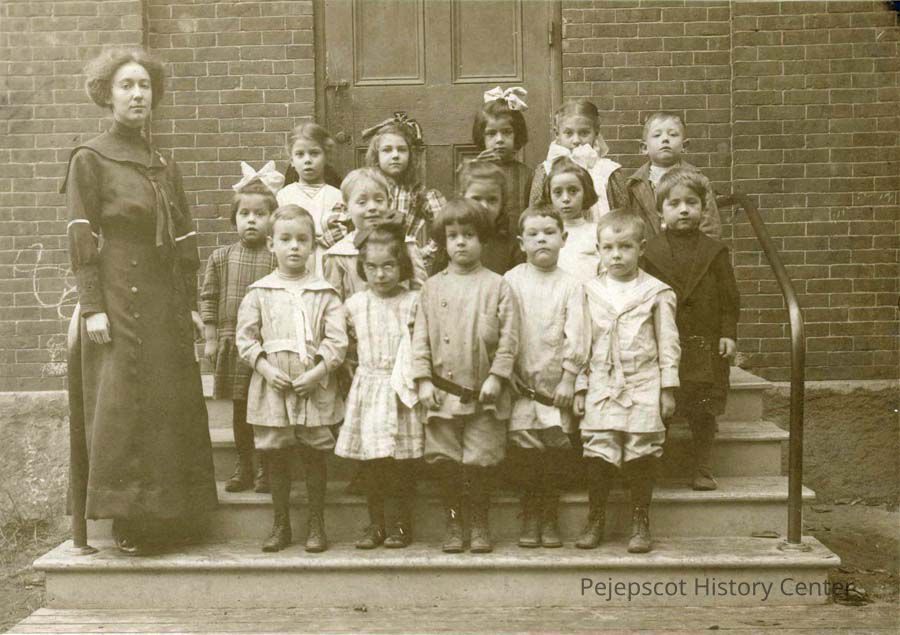 A B/W photo of a class at the Union Street School in Brunswick. Elizabeth (Bibbo) Riley is in the back row. 1910.