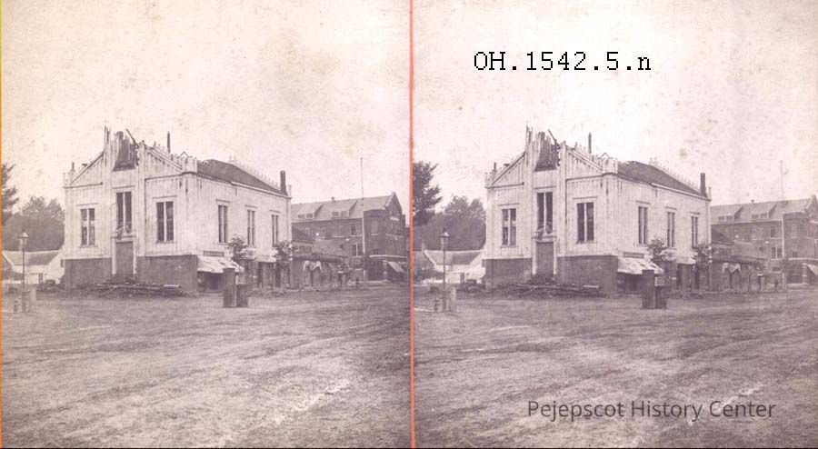 A B/W stereo view of the ruins of the Universalist Church which burnt on Oct. 4, 1884. The church stood on the corner of Maine and Mason Streets, Brunswick. The Dennison Manufacturing Co. building (Dunlap Block) can be seen in the background. Undated