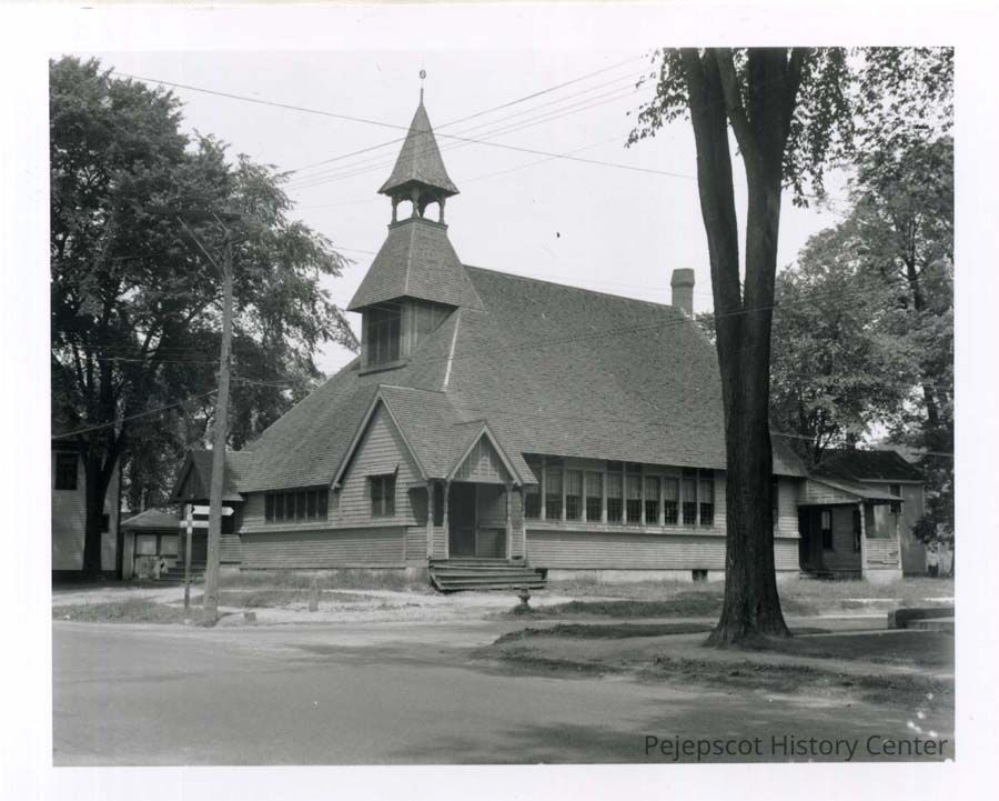 B/W photo of the old Universalist Church (1996 became The Church of Christ) on the corner of Jordan Avenue and Federal Street, July 1940.