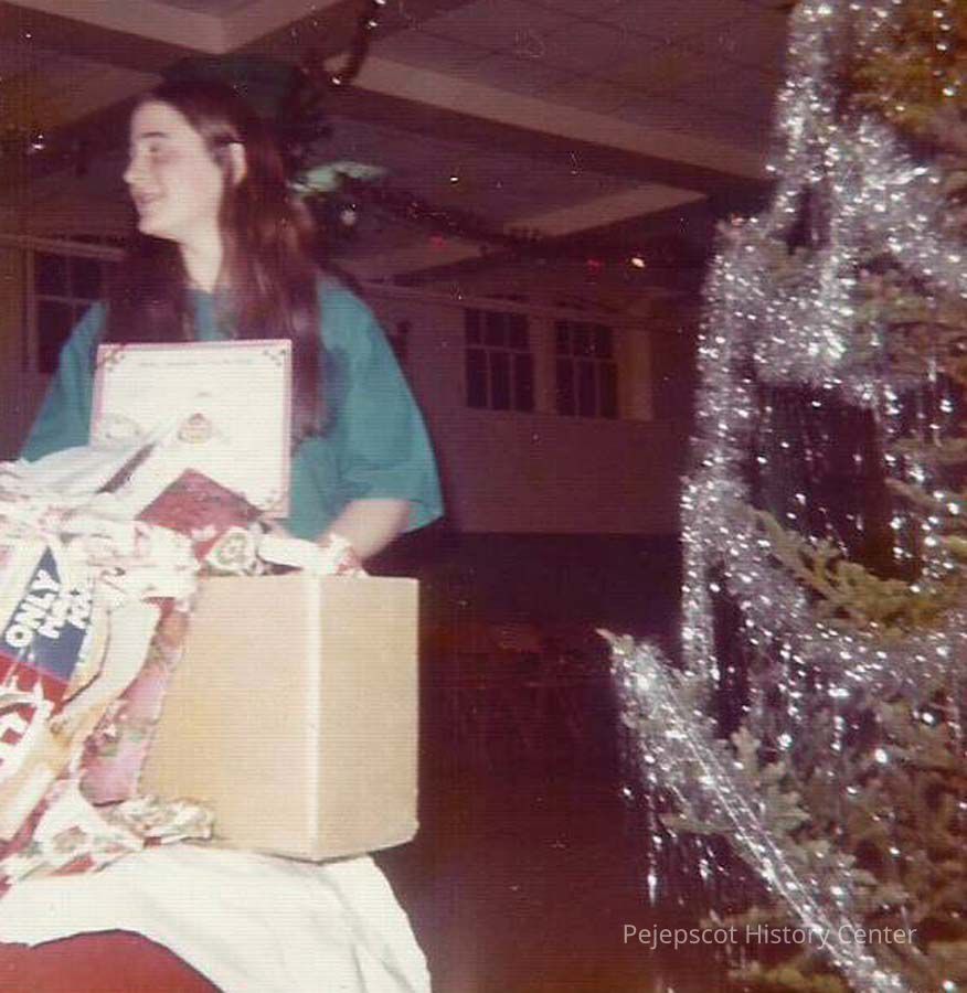 A color photograph of an unknown girl and a Christmas Tree.