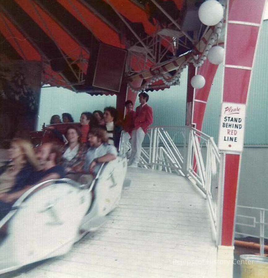 A color photograph of a group of unknown youngsters on a carnival ride.