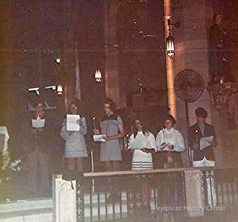 A color photograph of a group of people singing as well as holding candles.