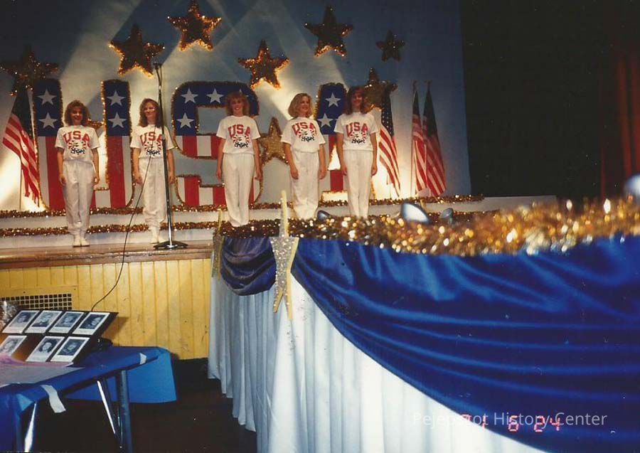 A color photograph of 5 unknown girls on a stage. CYO sponsored