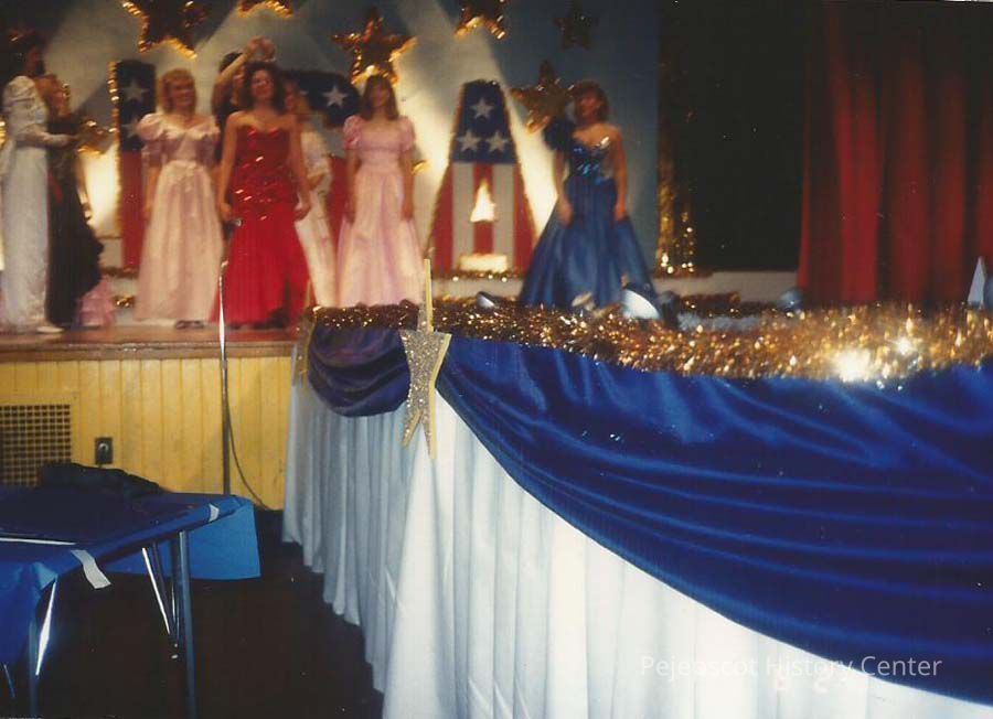 A color photograph of unknown girls dressed in gowns on stage. CYO sponsored