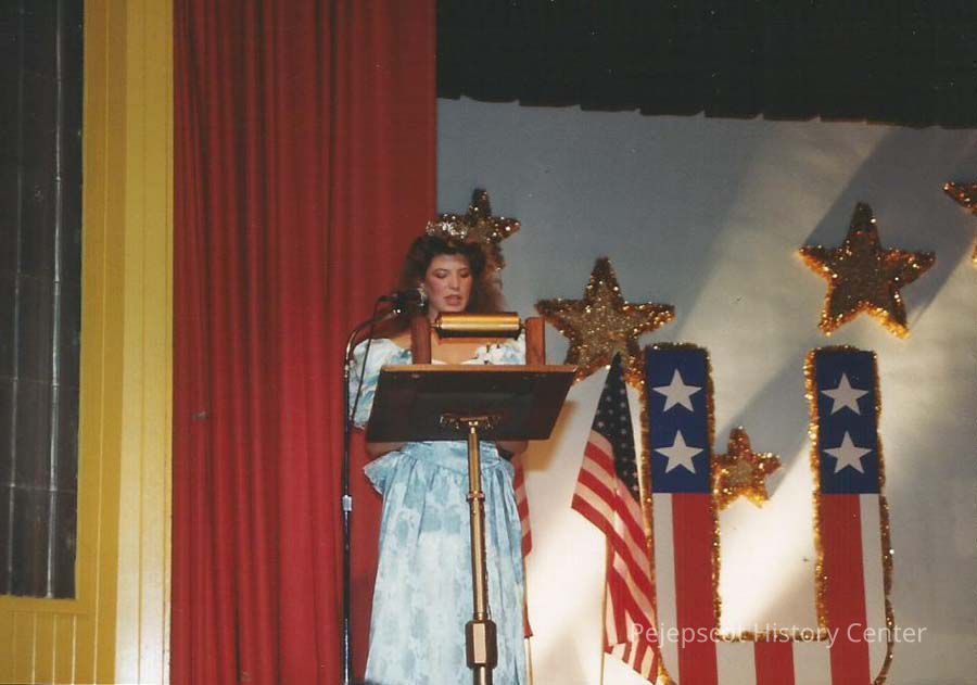 A color photograph of a girl speaking from a stage. CYO sponsored