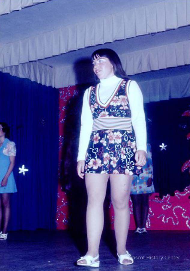 A 35 mm slide of a contestant in the 1975 Miss Teen Queen Pageant. It is marked "Jul 75" and "19". Sponsored by Christian Youth Organization (CYO).
