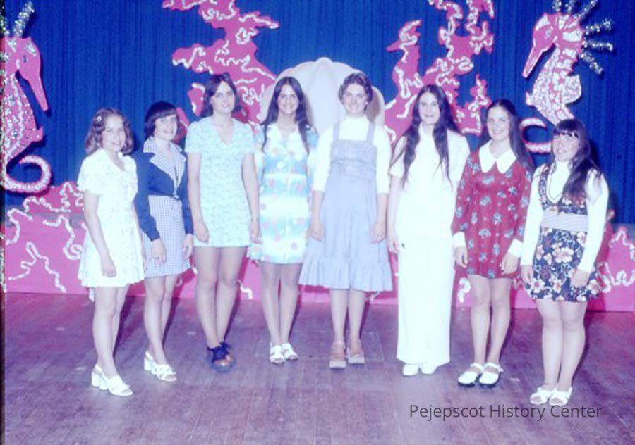 A 35 mm slide of a group of contestants in the 1975 Miss Teen Queen Pageant. It is marked "Jul 75", "1-37" and "11". Sponsored by Christian Youth Organization (CYO).