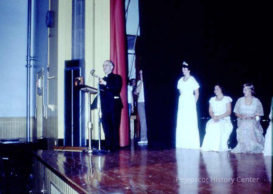 A 35 mm slide of 4 contestants and a priest in the 1978 Miss Teen Queen Pageant. It is marked "Jul 78" and "18". Sponsored by Christian Youth Organization (CYO).