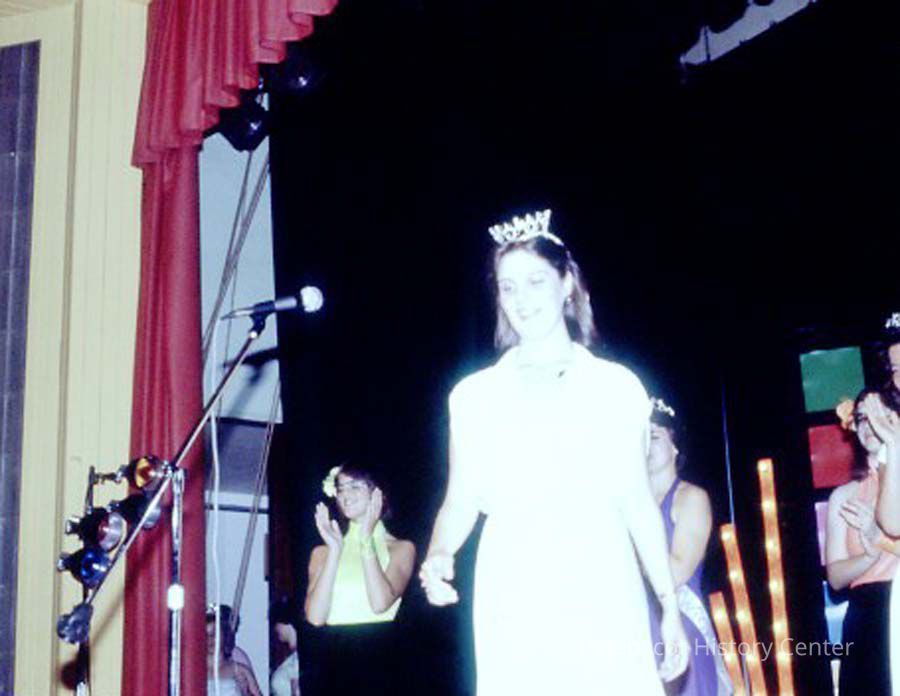 A 35 mm slide of a contestant in the 1979 Miss Teen Queen Pageant. It is marked "Jul 79" and "13". Sponsored by Christian Youth Organization (CYO).