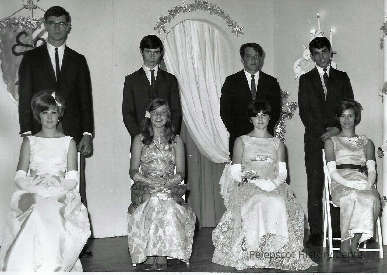 A B/W photograph of 4 teen queen participants and their escorts.