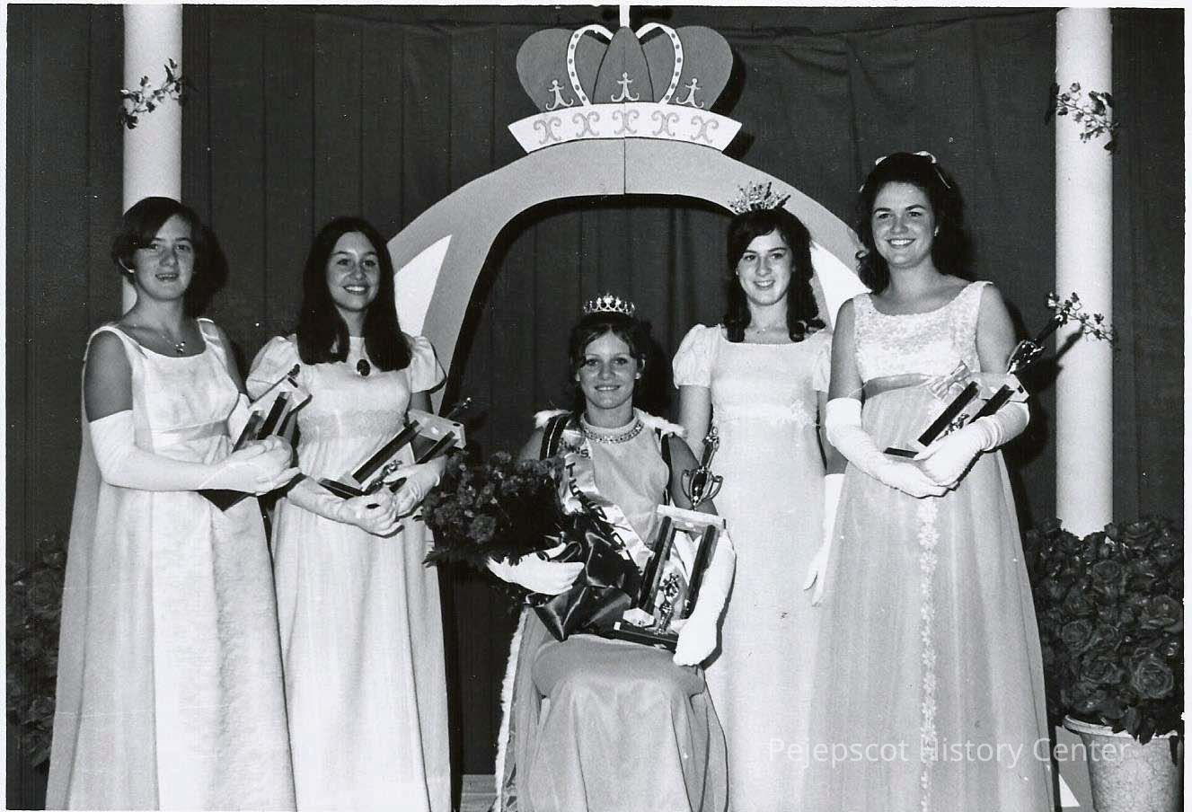 A B/W photograph of an unknown 5 girls. It looks like one of them has been crowned Teen Queen.