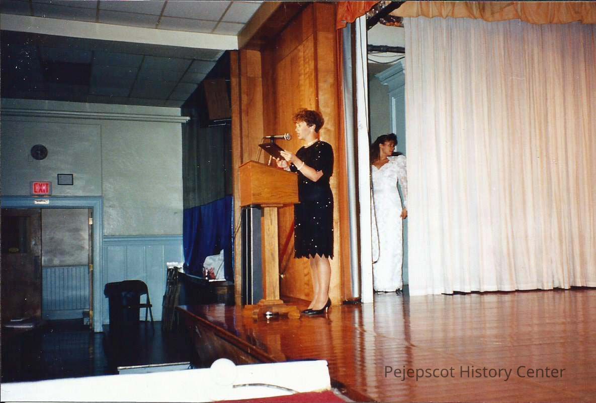 A color photograph of a woman talking at a podium. Photographer's # 1-18 CYO sponsored
