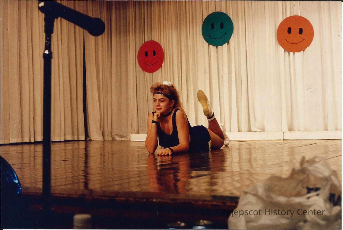A color photograph of a contestant lying on the stage floor. Photographer's # 3-17 CYO sponsored