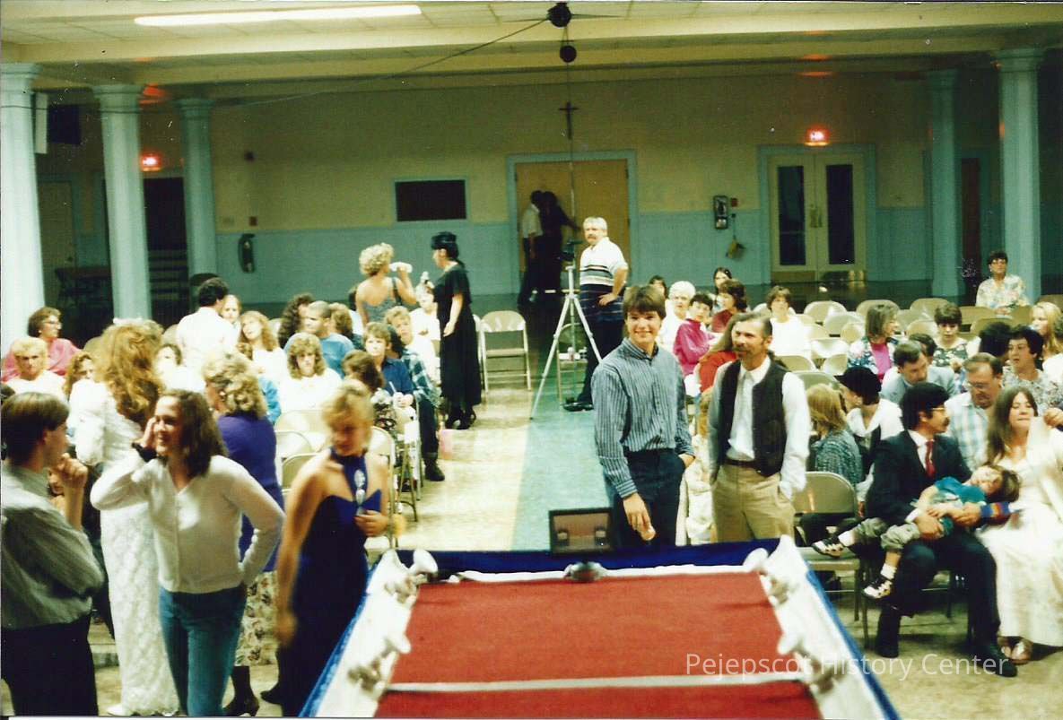 A color photograph of the crowd waiting for the pageant to start. Photographer's # 3-35 CYO sponsored