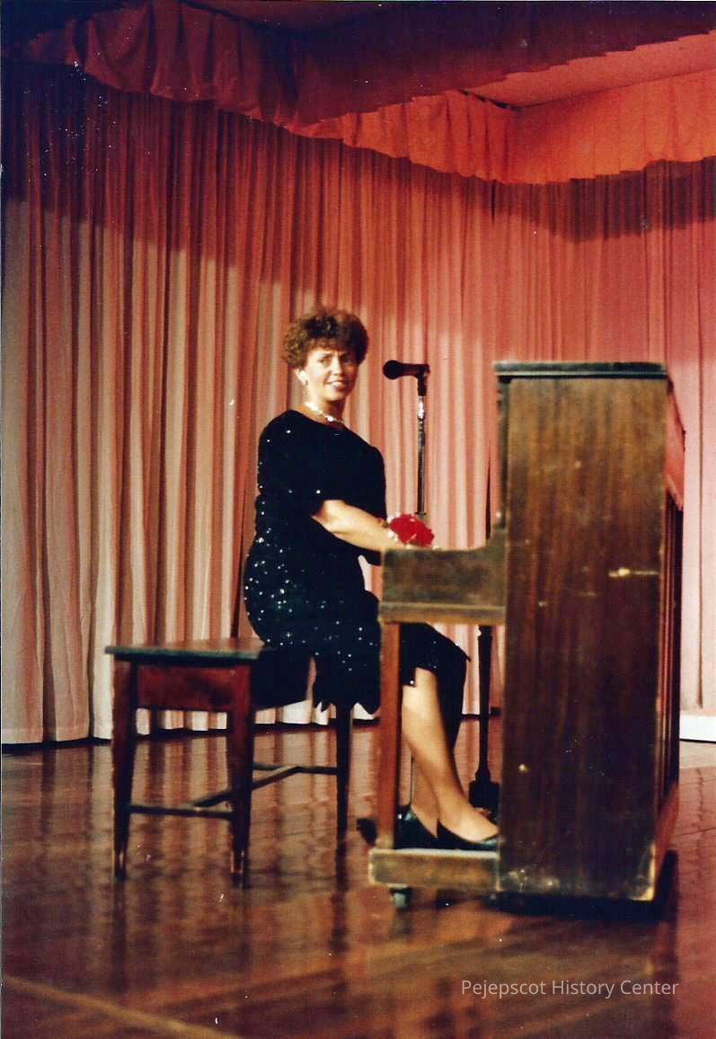 A color photograph of a woman playing a piano. Photographer's # 4-29 CYO sponsored