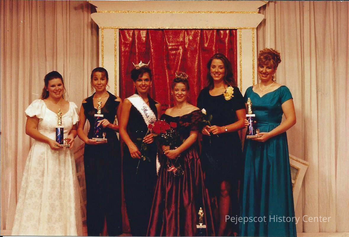 A colored photograph of 6 girls. Three re holding statues and one has a banner which reads, Miss Maine".