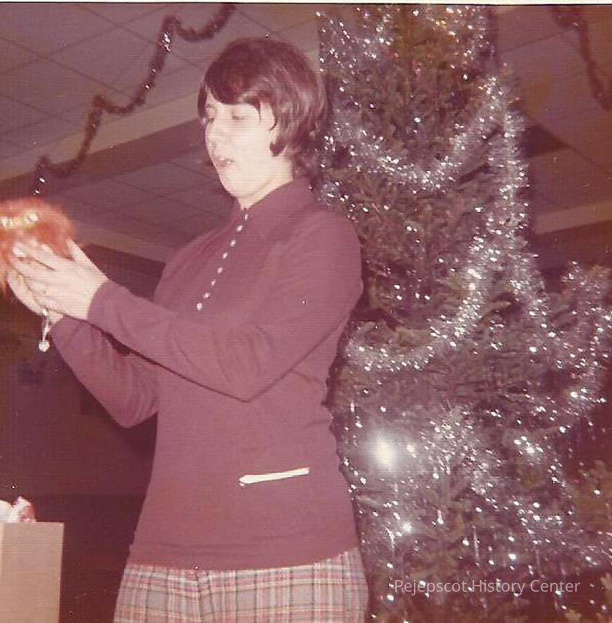A color photograph of an unknown girl in front of a Christmas tree.