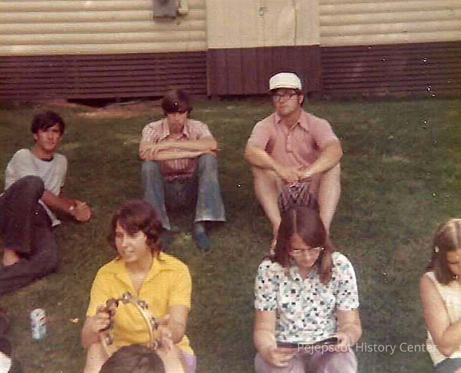 A color photograph of some young people sitting on a lawn.