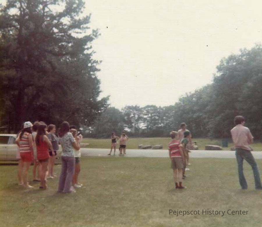A color photograph of a group of young people standing on a lawn.