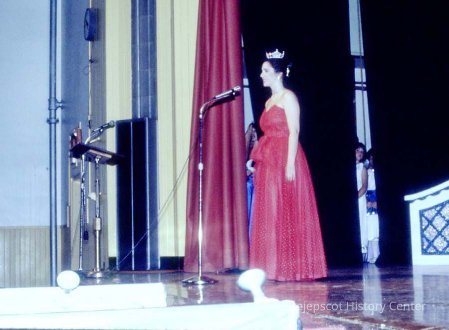 A 35 mm color slide of a contestant in the 1983 Miss Teen Queen Pageant. The slide is marked, "Jul 83" and "2".