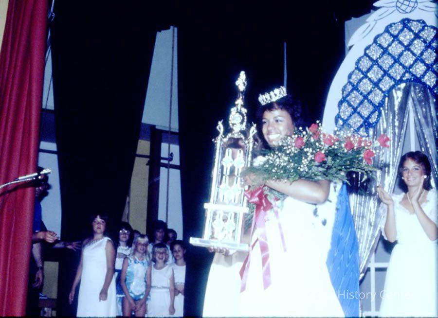 A 35 mm color slide of a contestant in the 1983 Miss Teen Queen Pageant. The slide is marked, "Jul 83", "14" and "S118".