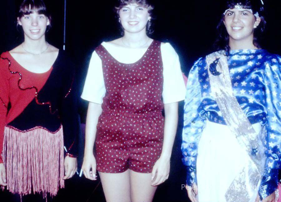 A 35 mm color slide of 3 contestants in the 1984 Miss Teen Queen Pageant. The slide is marked, "Jul 84" and "9".