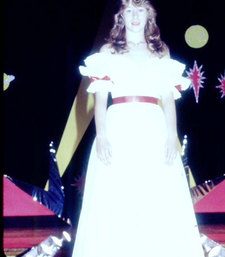 A 35 mm color slide of a contestant in the 1984 Miss Teen Queen Pageant. The slide is marked, "Jul 84" and "2".