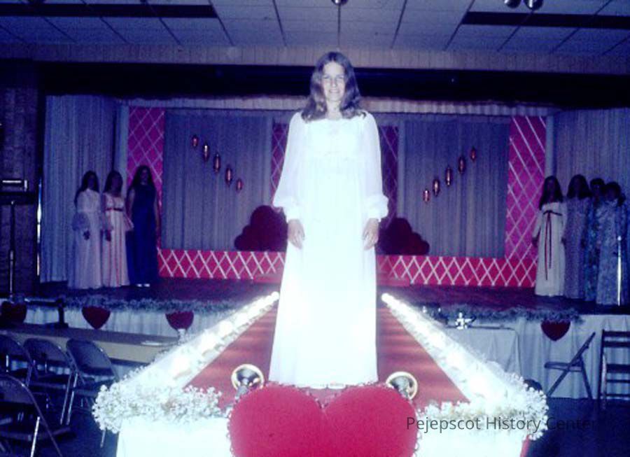 A 35 mm slide of a contestant in the 1974 Miss Teen Queen Pageant. It is marked "Jul 74" and "1". Sponsored by Christian Youth Organization (CYO).