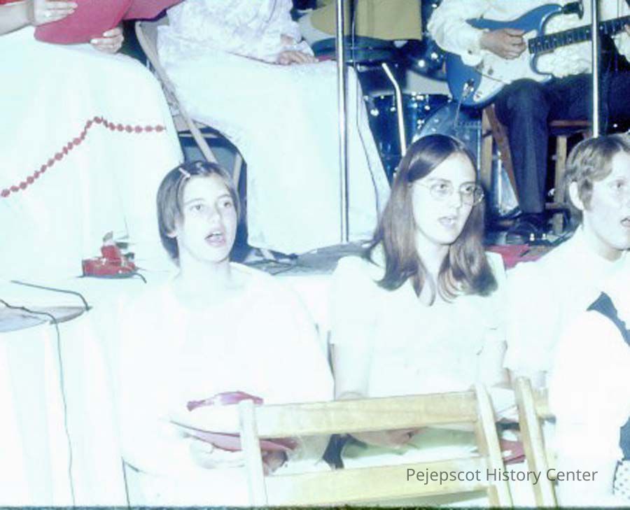 A 35 mm slide of the contestants singing in the 1974 Miss Teen Queen Pageant. It is marked "Jul 74" and "13". Sponsored by Christian Youth Organization (CYO).