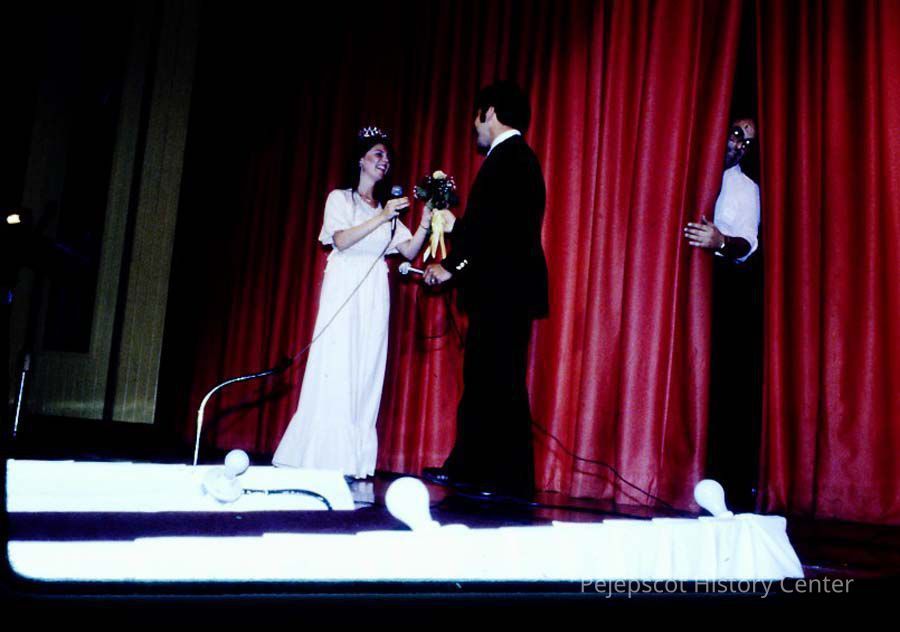 A 35 mm color slide of a winner presented with some flowers in the 1980 Miss Teen Queen Pageant. The slide is marked, "Jul 80" and by a printed "12". Sponsored by Christian Youth Organization (CYO).