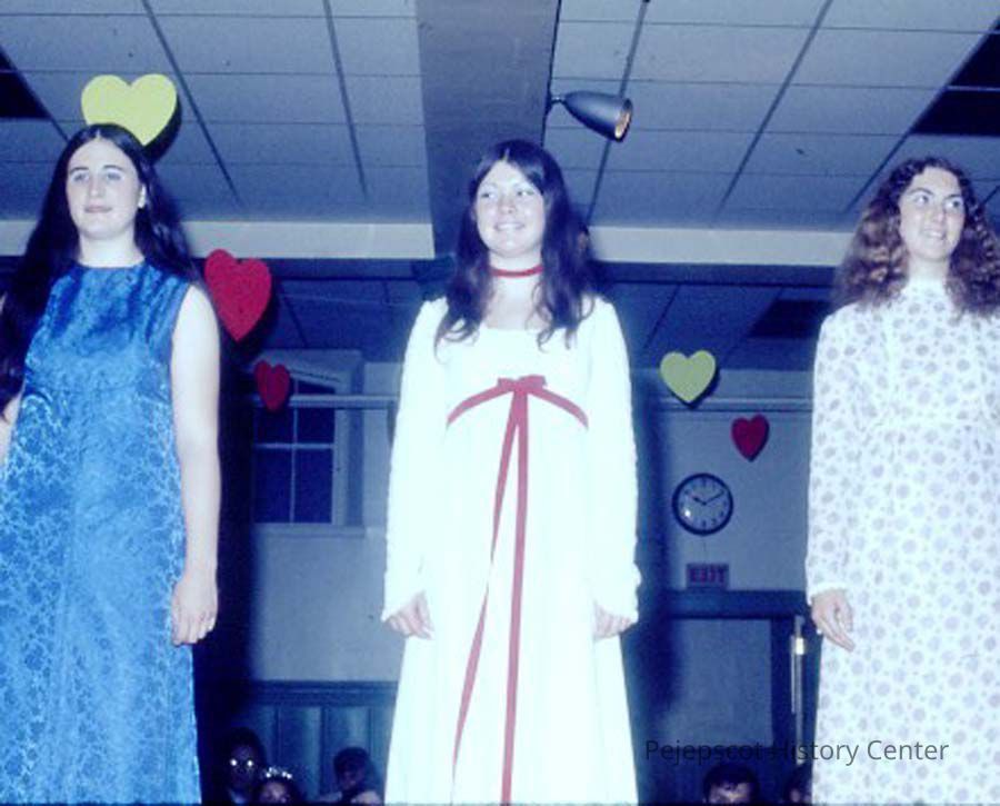 A 35 mm slide of 3 contestants in the 1974 Miss Teen Queen Pageant. It is marked "Jul 74" and "9". Sponsored by Christian Youth Organization (CYO).