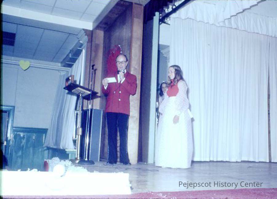 A 35 mm slide of a contestant and the MC in the 1974 Miss Teen Queen Pageant. It is marked "Jul 74" and "5". Sponsored by Christian Youth Organization (CYO).