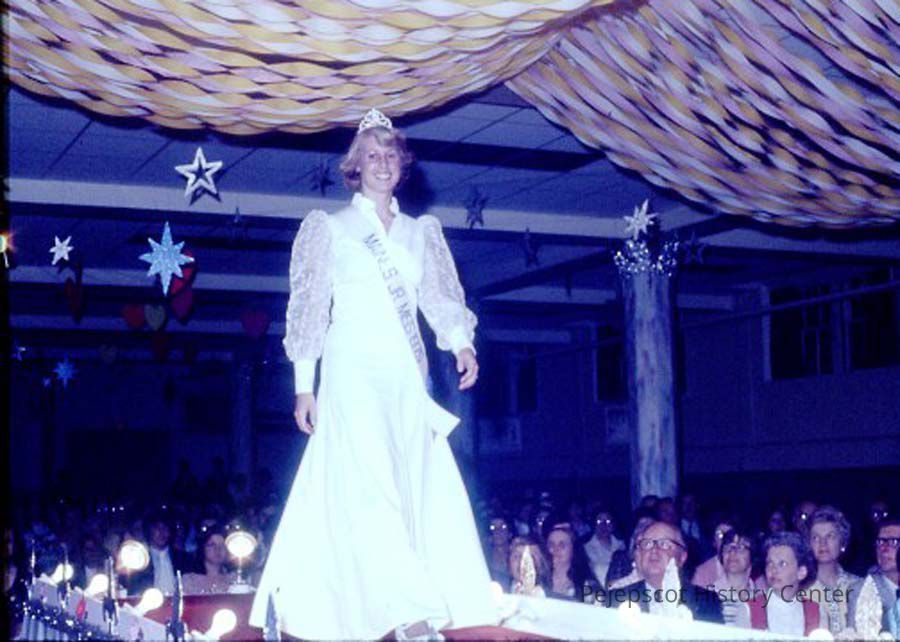 A 35 mm slide of a woman with another title at the 1975 Miss Teen Queen Pageant. It is marked "Jul 75" and "1". Sponsored by Christian Youth Organization (CYO).