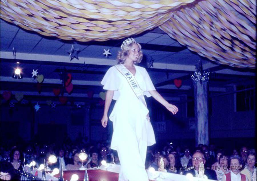 A 35 mm slide of a woman at the 1975 Miss Teen Queen Pageant. It is marked "Jul 75" and "2". Sponsored by Christian Youth Organization (CYO).