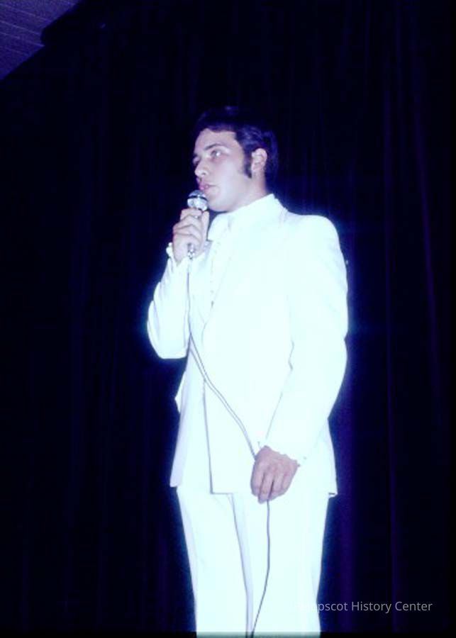 A 35 mm slide of the MC in the 1975 Miss Teen Queen Pageant. It is marked "Jul 75" and "8". Sponsored by Christian Youth Organization (CYO).