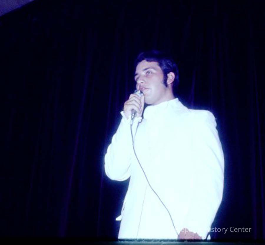 A 35 mm slide of a singer (maybe?) in the 1975 Miss Teen Queen Pageant. It is marked "Jul 75" and "11". Sponsored by Christian Youth Organization (CYO).