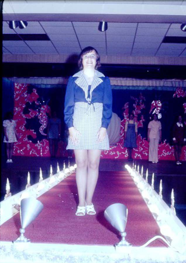 A 35 mm slide of a contestant in the 1975 Miss Teen Queen Pageant. It is marked "Jul 75" and "4". Sponsored by Christian Youth Organization (CYO).