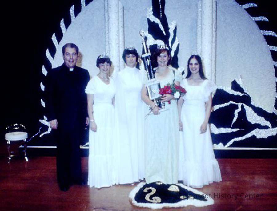 A 35 mm slide of 5 contestants in the 1978 Miss Teen Queen Pageant. They are all wearing tiaras. The girl in the middle is holding the trophy and bouquet of flowers.There is a priest with them. It is marked "Jul 78" and "20". Sponsored by Christian Youth Organization (CYO).