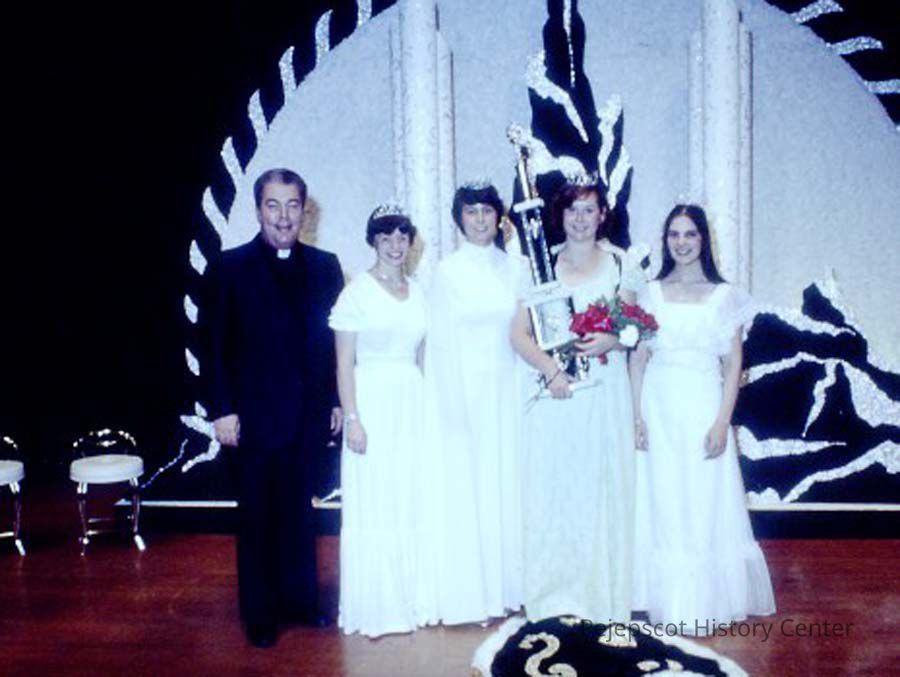 A 35 mm slide of 5 contestants in the 1978 Miss Teen Queen Pageant. They are all wearing tiaras. The girl in the middle is holding the trophy and bouquet of flowers.There is a priest with them. It is marked "Jul 78" and "19". Sponsored by Christian Youth Organization (CYO).