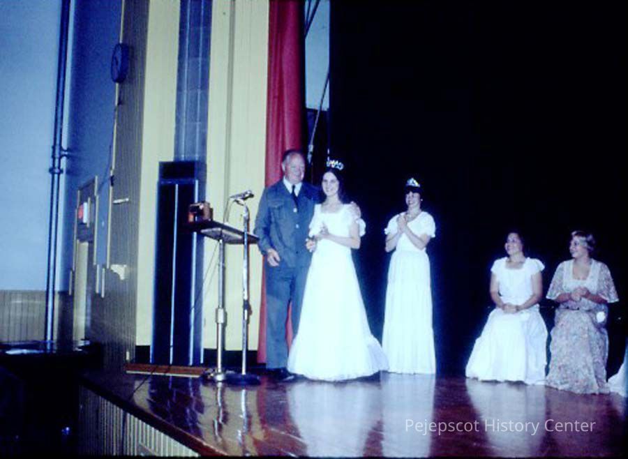 A 35 mm slide of 4 contestants and a man in the 1978 Miss Teen Queen Pageant. Two of the girls are wearing tiaras. It is marked "Jul 78", and "15". Sponsored by Christian Youth Organization (CYO).