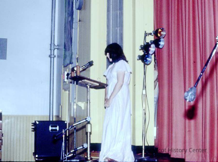 A 35 mm slide of a contestant in the 1979 Miss Teen Queen Pageant. It is marked "Jul 79". "1-1" and "3". Sponsored by Christian Youth Organization (CYO).