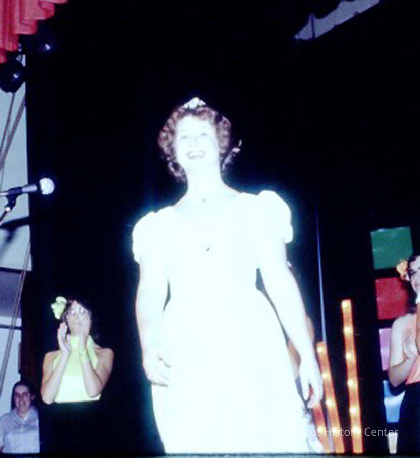 A 35 mm slide of a winner in the 1979 Miss Teen Queen Pageant. It is marked "Jul 79" and "15". Sponsored by Christian Youth Organization (CYO).