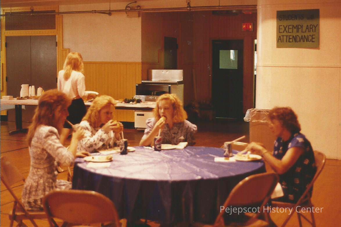 A color photograph of a group of girls eating lunch.
