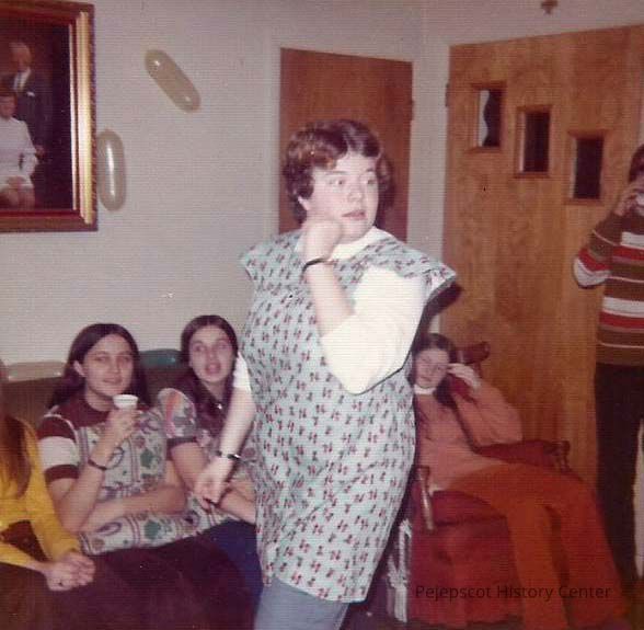 A color photograph of an unknown woman with some young people sitting around.