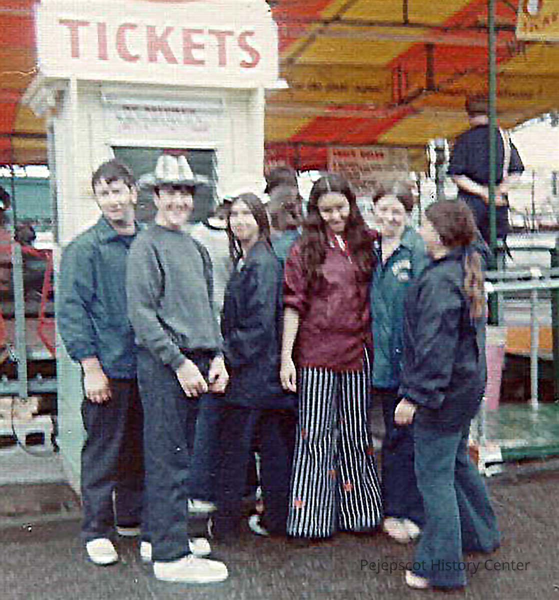 A color photograph of an unknown group in front of a ticket booth.