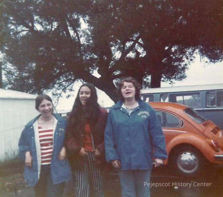 A color photograph of 3 girls standing by a red volkswagon.