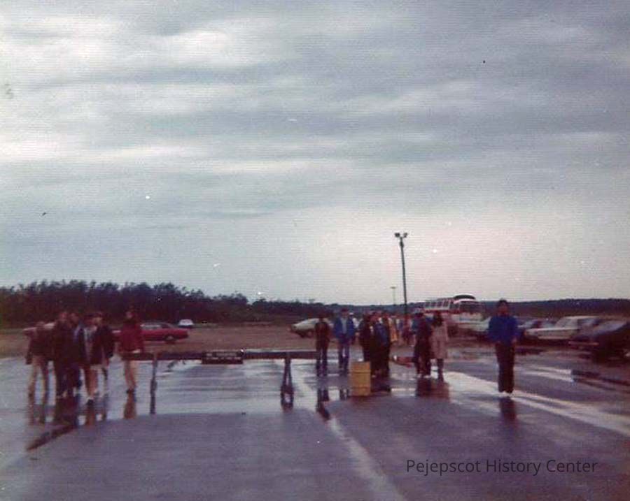 A color photograph of a group of people in a wet parking lot.