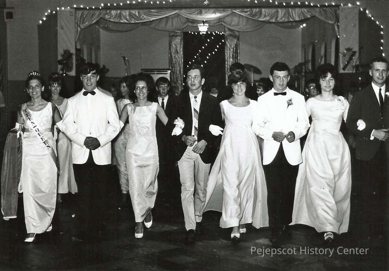 A B/W photograph of a group of people walking. One of them is wearing a "Teen Queen", banner.