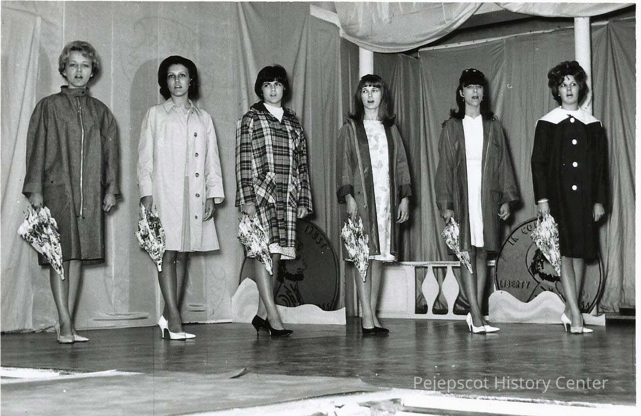 A B/W photograph of 6 girls in street clothes, carrying umbrellas.