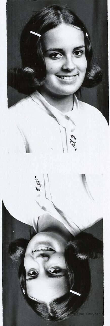 A B/W photograph of an unknown Two pictures on a strip. One upside down compared to the other.